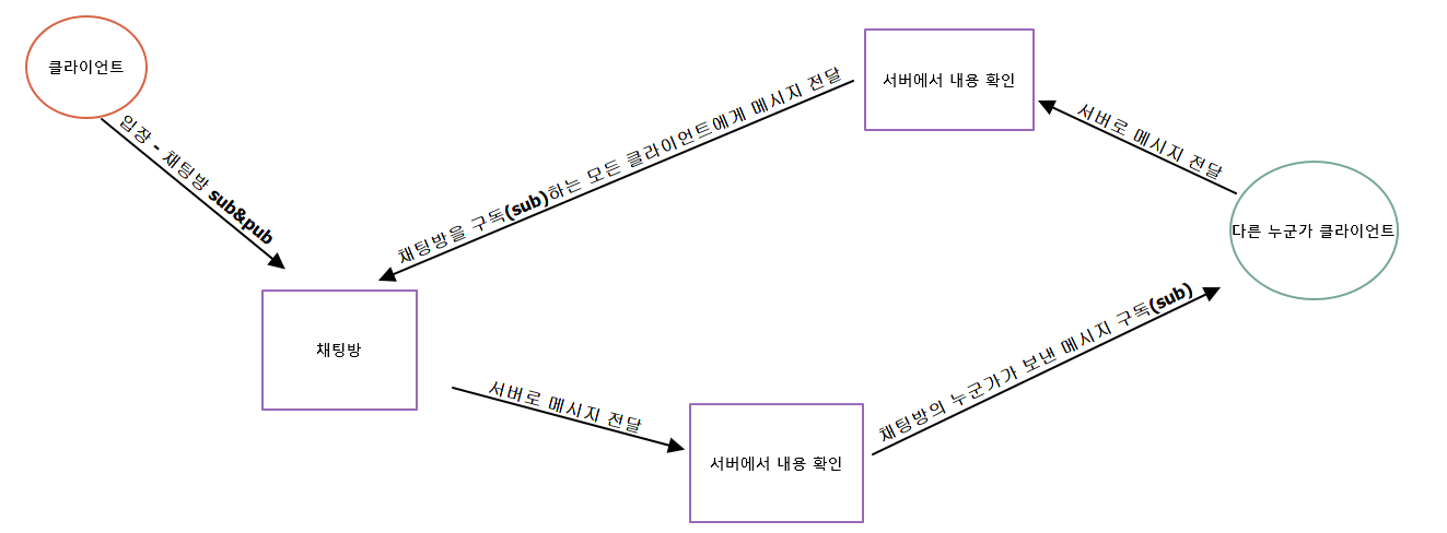 채팅방 입장 : Topic 구독(sub) -> 해당 채팅방을 웹 소켓이 연결되어있는 동안 구독한다. 구독의 개념은 해당 채팅방을 지속적으로 바라본다라고 생각하면 좋다. 지속적으로 연결되고 바라보고 있기 때문에 새로운 채팅이 송신(pub) 되면 이를 수신(구독, sub) 할 수 있다