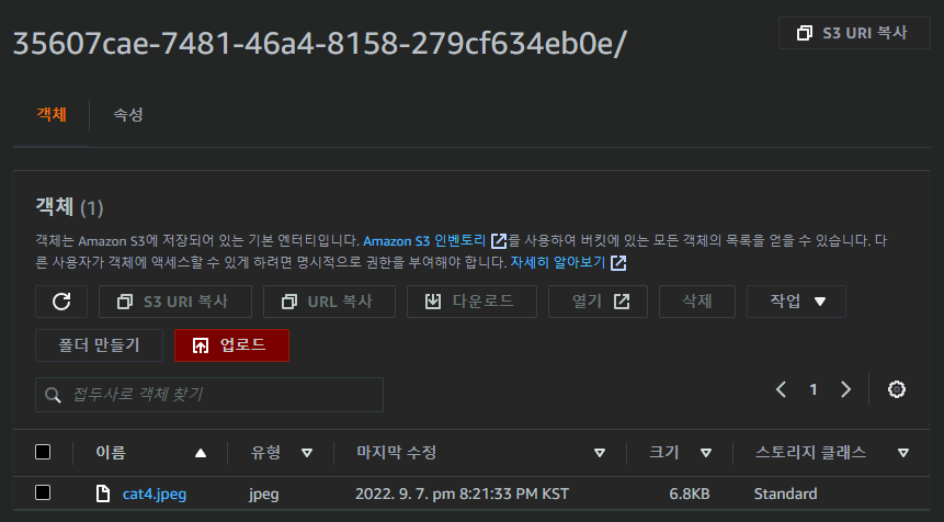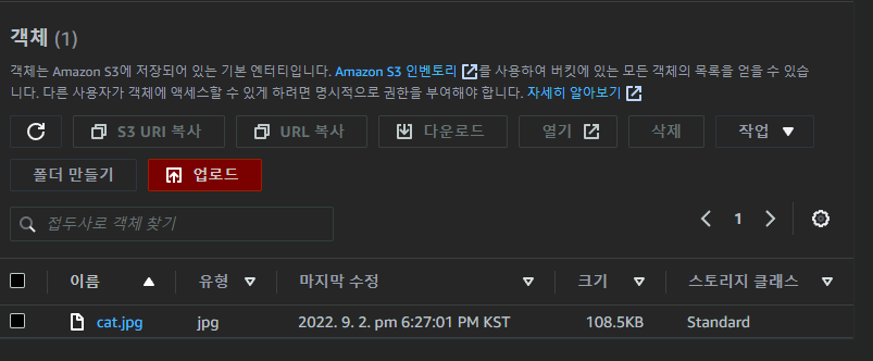 - s3 bucket 확인 : 현재에는 임시로 올려둔 cat.jpg 밖에 보이지 않는다.