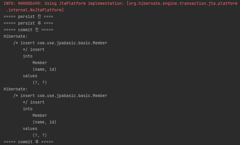 - 엔티티 매니저는 트랜잭션을 커밋하기 전까지 DB 에 엔티티를 반영하지 않고, 엔티티 매니저 안 내부 쿼리 저장소 라는 곳에 insert SQL 들을 모아 둔다. 이후 트랜잭션을 커밋하는 순간 SQL 을 DB 로 보낸다. 이것을 쓰기 지연 이라고 한다.