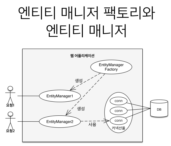 - 고객으로부터 요청이 올때마다 EntityManagerFactor 가 EntityManager 를 생성하고 생성된 EntityManager 이 DB 에 쿼리를 날려서 요청을 처리하게 된다.