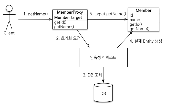 => JPA 가 프록시를 통해서 가짜 클래스만들고, 이 가짜 클래스 안에 DB 에서 조회한 결과를 가져와 채워넣음