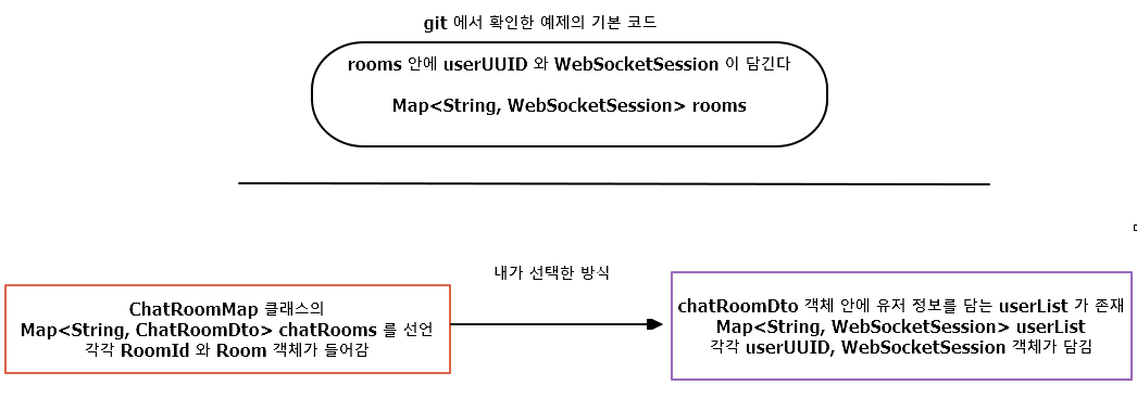 먼저 git 에서 확인했던 예제 코드에서 유저 정보를 담는 Map 은 사진처럼 생겼었다. 이를 내 코드에 적용하기 위해서 그림처럼 고치게 되었다.