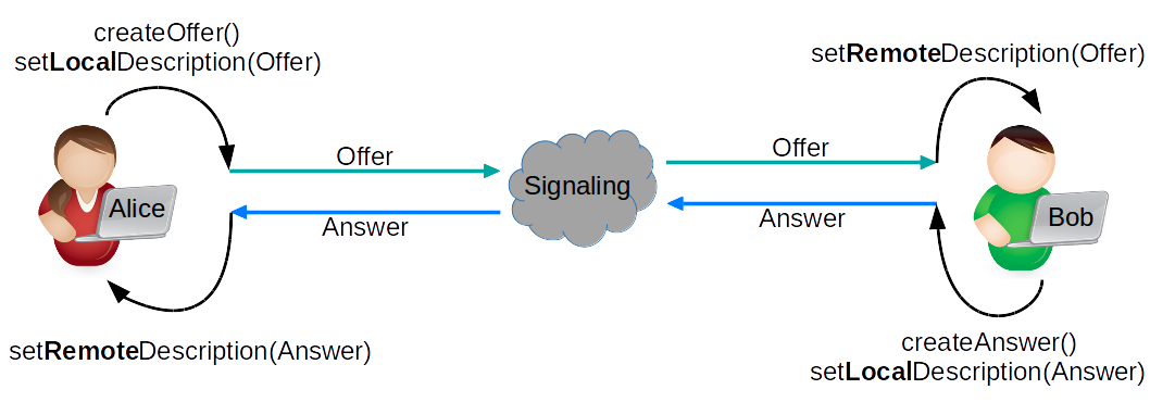 현재 Alice와 Bob 두명의 Peer가 있다. Alice와 Bob은 서로 SDP 기반의 Offer와 Answer 메시지를 주고 받는다.