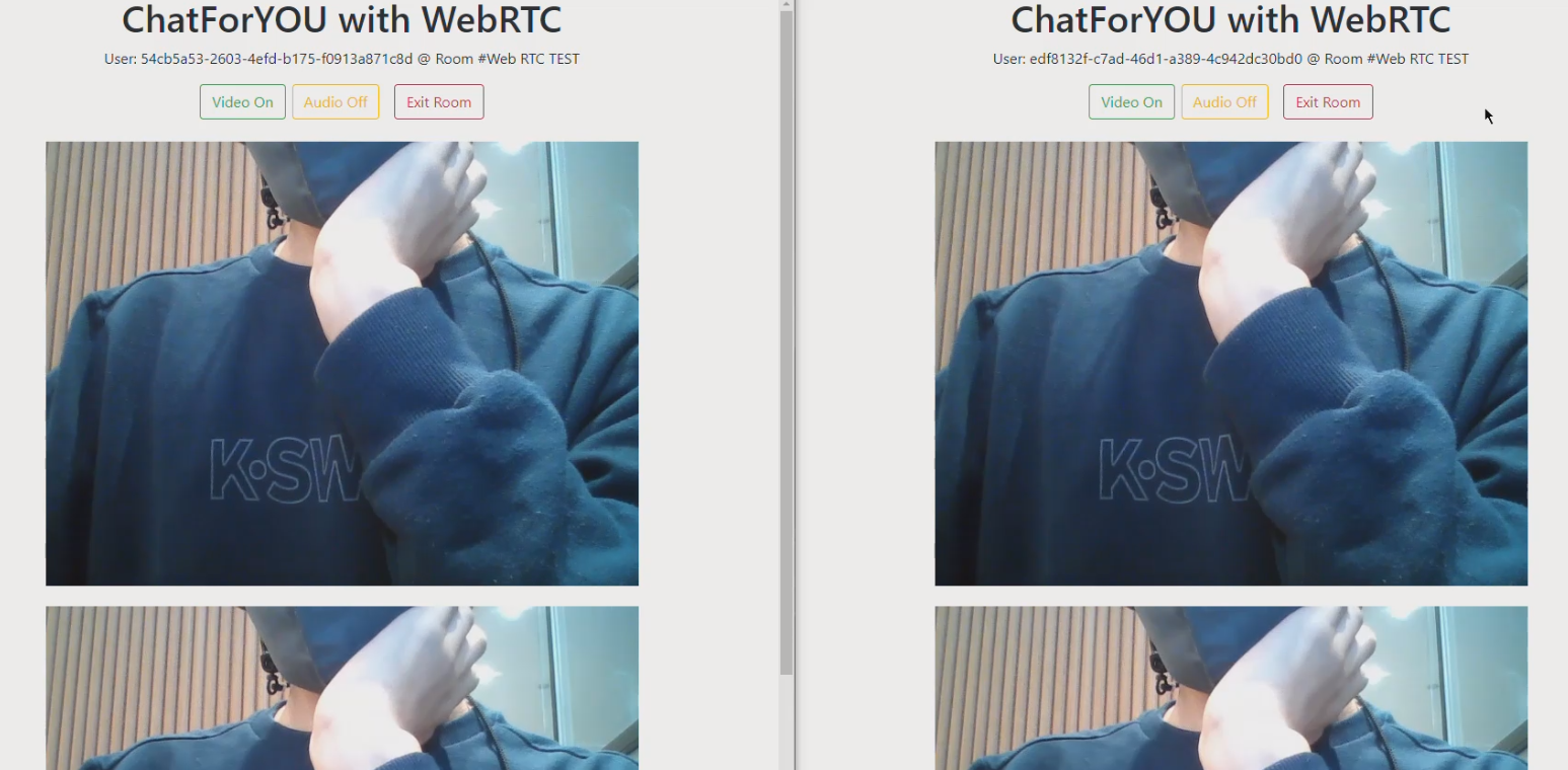 - 음성, 영상 모두 가능하나, Only 1:1 만 지원한다. 이는 Mesh 방식의 1:1 P2P 방식의 코드로 구현했기 때문이다. 목표는 1:N 이었는데 이렇게되면 단순한 Mesh 방식 대신 미디어 서버를 두는 방법을 사용해야했다. 결국 이 미디어 서버의 구현에서 막혀버렸다.