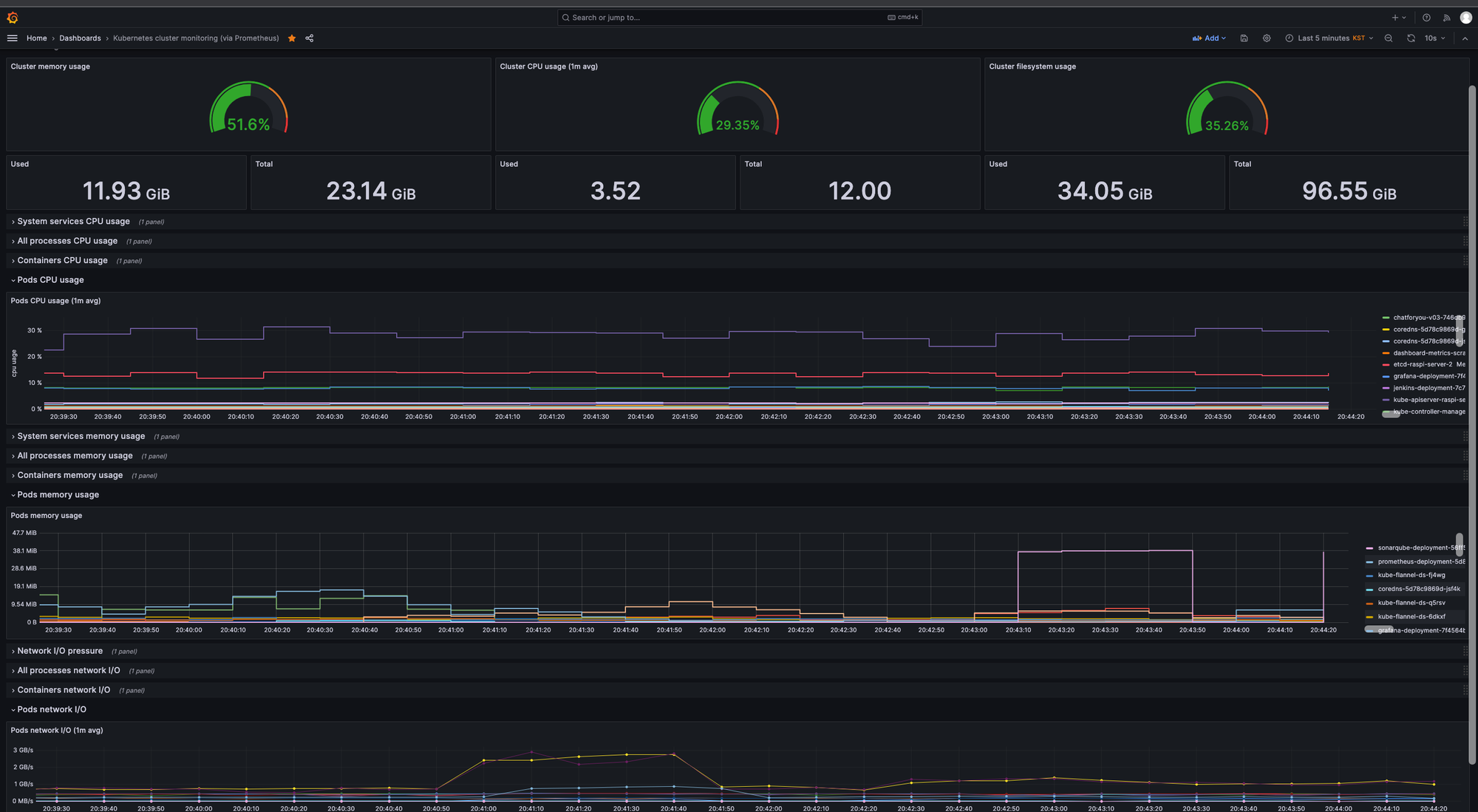 그렇게 다른 분의 대시보드를 가져와 만든 kubernetes 의 성능 모니터링 - Ram 사용량, CPU 사용량, 네트워크, 파드, 컨테이너 등 - 을 위한 대시보드!! 여기서 내가 했던 작업은 단순히 grafana 와 prometheus 를 연결하고, prometheus 와 kubernetes metrics 를 연결하는 정도였다.