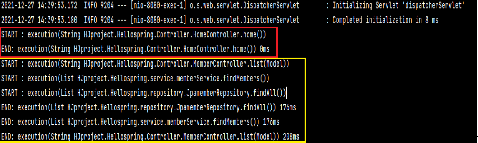 // 따라서 excution(* 접근제어자 전체 HJproject 패키지. Hellospring 패키지. * 메소드 전체)