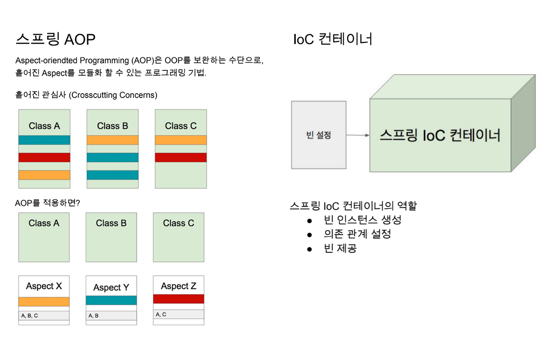 Spring AOP (Aspect Oriented Programming) - AOP는 관점 지향 프로그래밍으로 "기능을 핵심 비즈니스 기능과 공통 기능으로 '구분'하고, 공통 기능을 개발자의 코드 밖에서 필요한 시점에 적용하는 프로그래