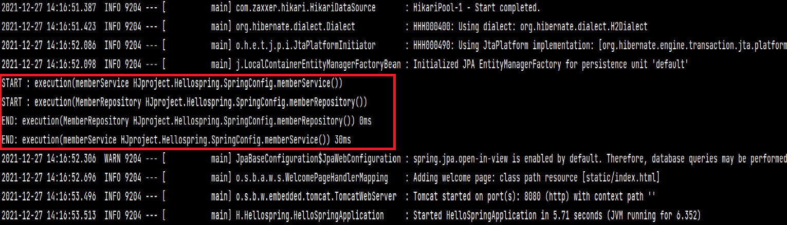 이제 spring을 실행하면 아래와 같이 memberService 에서는 proxy 가 적용된 모습을, 그리고 HellospringApplication 에서는 이반적으로 실행되는 모습을 확인 할 수 있다.