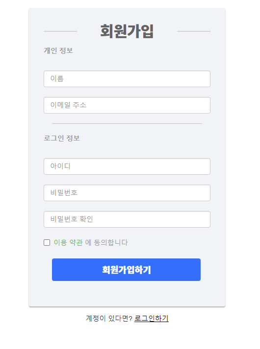 메인 페이지 및 로그인 페이지, 회원 가입 페이지는 프론트를 공부하는 친구가 도와주었다. 너무 감사하다.