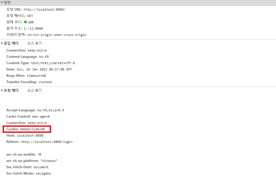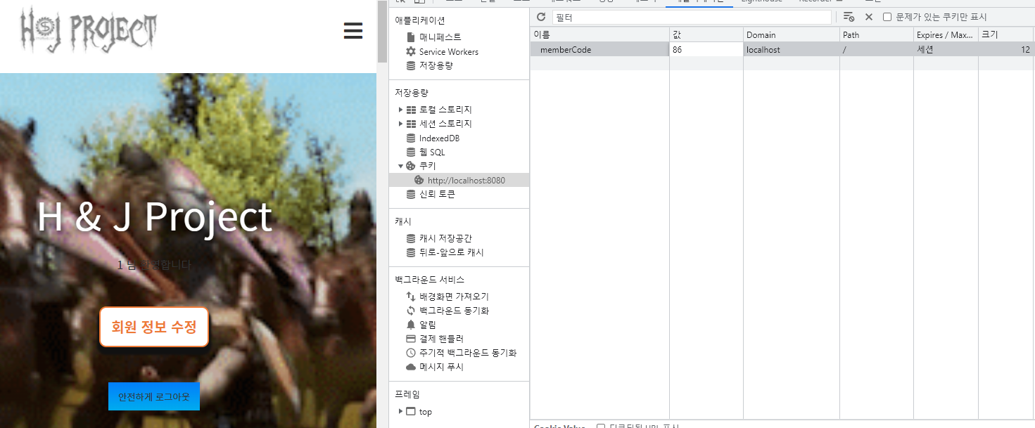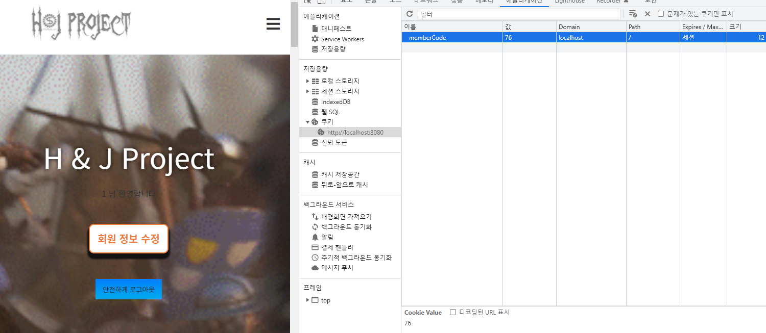 - 쿠키값은 Controller 를 통해서 로그인 시 생성되는데 쿠키값 안에는 DB 회원의 고유 번호(memberCode)를 저장해둔다. 즉 로그인 후 쿠키를 확인해보면 로그인 한 사람의 memberCode 를 알 수 있게 되는것이다.