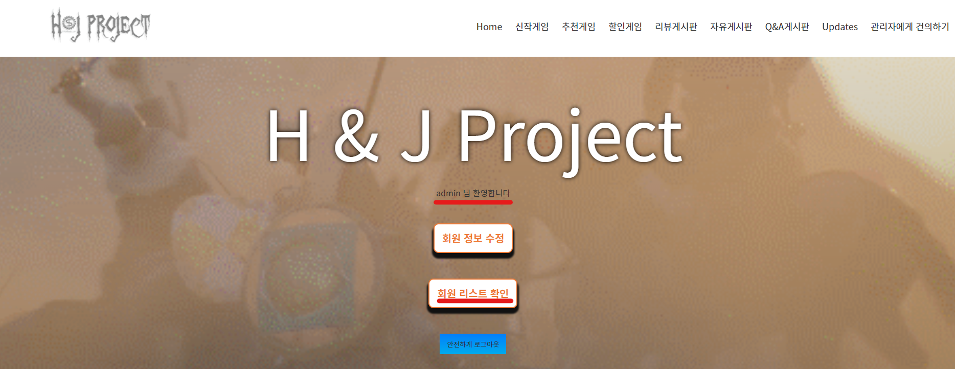- 만약 관리자가 로그인 한 경우 관리자 전용 페이지는 회원 관리 페이지와 로그아웃이 있는 페이지를 열어줍니다.