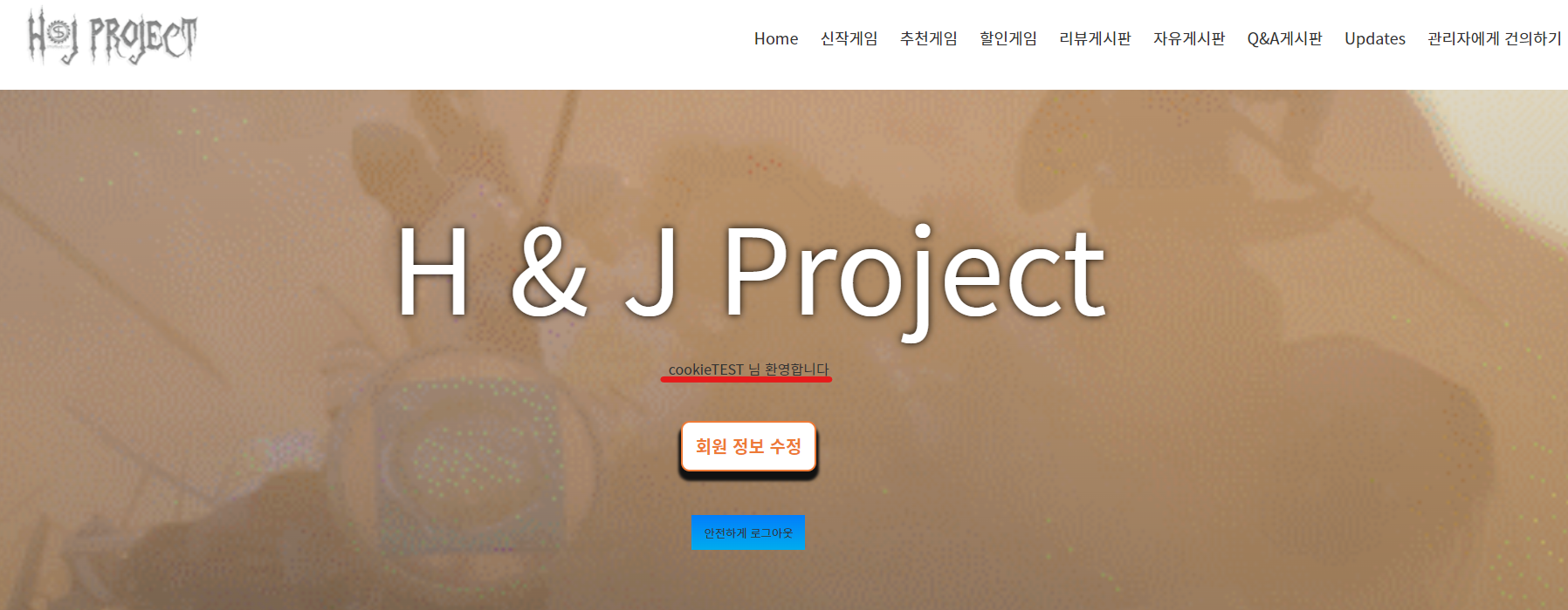 - 메인 페이지에서 로그인 버튼을 눌러서 로그인 하면 일반 회원의 경우 한 사람의 이름과 회원 수정, 로그아웃이 있는 페이지로 보냅니다.