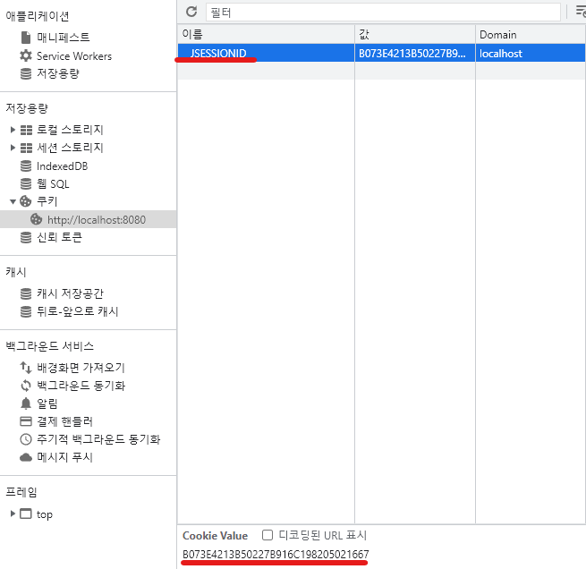 - 쿠키 이름은 JSESSIONID, 값은 역시 추정불가능한 UUID 값