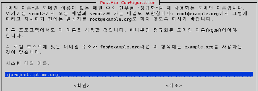 2. 다음으로 시스템 메일 이름을 설정하는 곳에는 본인이 사용할 메일 주소의 뒤쪽 즉, hostname(ex. gmail.com, naver.com) 을 적어주시면 됩니다. 다만 저는 쉽게 하기위해서 DomainName과 HostName을 통일시킬 예정이며, 제가 사용하고 있는 DDNS 를 그대로 사용하겠습니다
