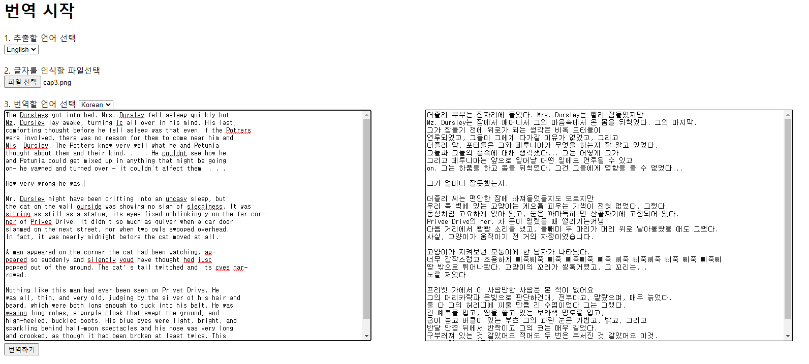 3. 텍스트가 추출 된 후 '번역하기' 버튼을 눌러 텍스트를 번역한다.